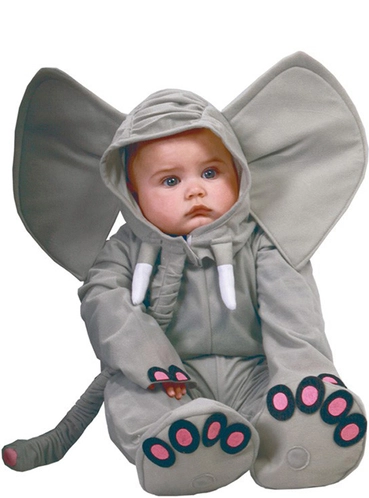 Includes a grey suit with a hood with big ears and trunk, and feet with pink footprint.
