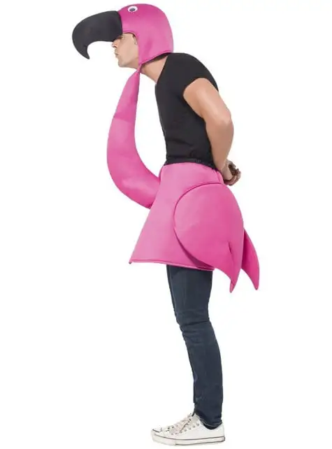 Includes a pink jumpsuit in the shape of a flamingo body and a head piece that mimics the head and beak of the animal.