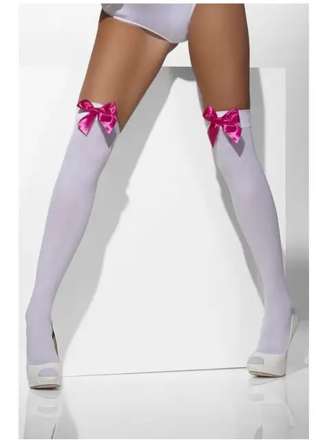 You’ll be the sexiest at the party with these white hold up tights with pink bows.